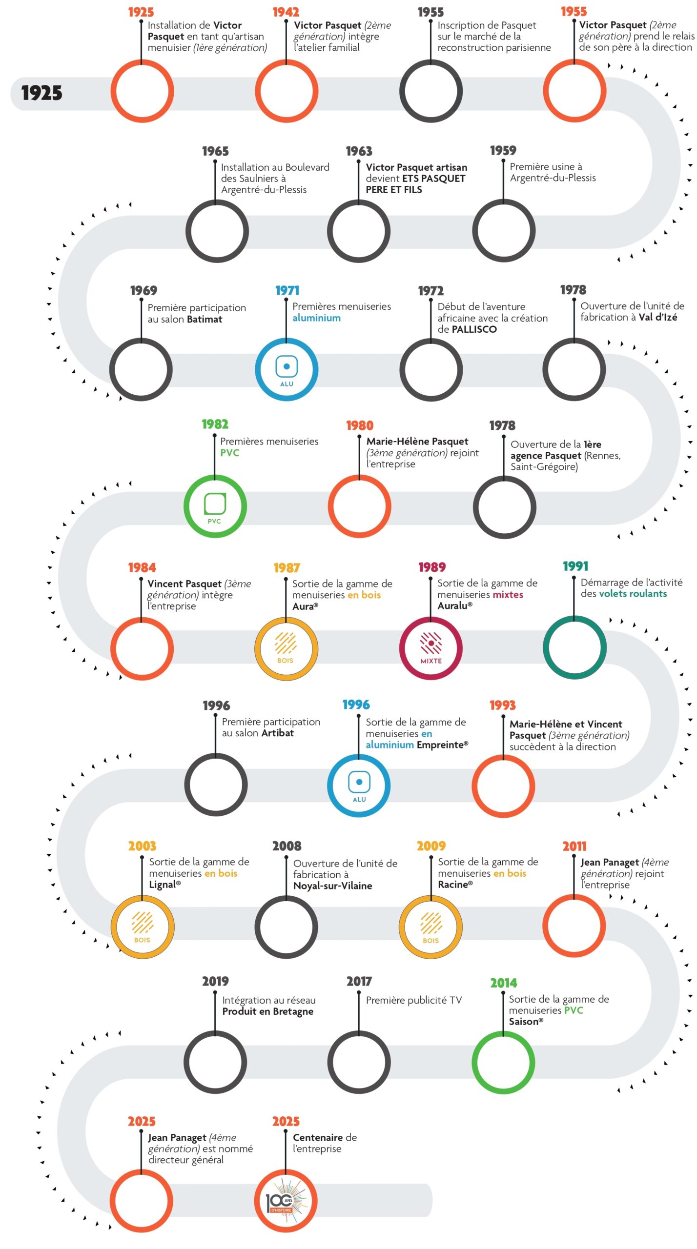La société déménage en 1965 sur le site qu’elle occupe toujours aujourd’hui où seront intégrés en 1971 la fabrication de menuiseries aluminium, des portes d’entrée en 1983 et de la menuiserie mixte en 1989. La menuiserie PVC est intégrée au catalogue dès 1982. Pasquet menuiseries se transforme et devient un acteur incontournable de la menuiserie industrielle.