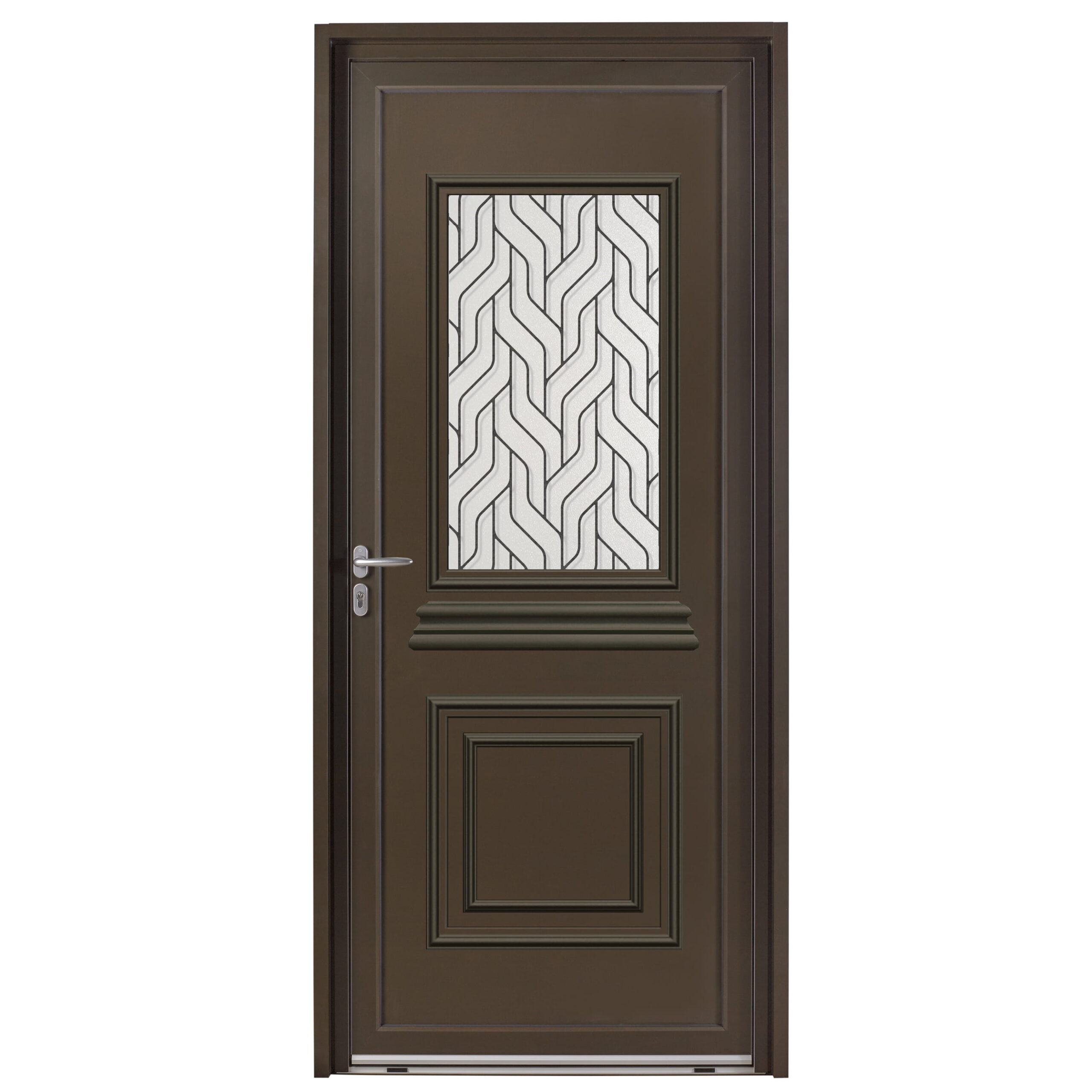 Le modèle de porte d’entrée aluminium Albarine est équipé d’un triple vitrage feuilleté dépoli avec une véritable grille aux motifs géométriques entrelacés.